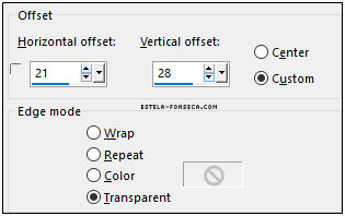 14- Image / Resize / 50%... Resize All Layers ... Desmarcado Adjust / Sharpness / Sharpen More Effects / Image Effects / Offset: -150 / 0 / Custom / Transparent