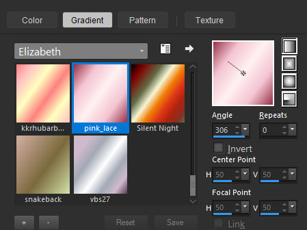 1. Na paleta de materiais...Primeiro plano Gradiente « pink_lace » LINEAR e configure como segue: