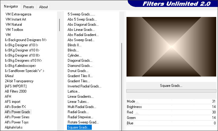 Effects / Plugins / Filters Unlimited 2.0 / Alf’s Power Grads / Square Grads / Default