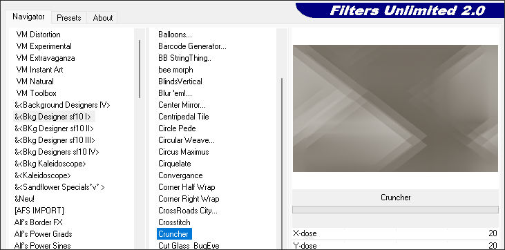 6. Effects / <I.C.NET Software> Filters Unlimited 2.0 / Bkg Designers sf10I / Cruncher / Default (20/20)