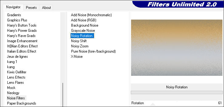 3- Effects / Plugins /Filters Unlimited 2 / Noise Filters / Noisy Rotation / default