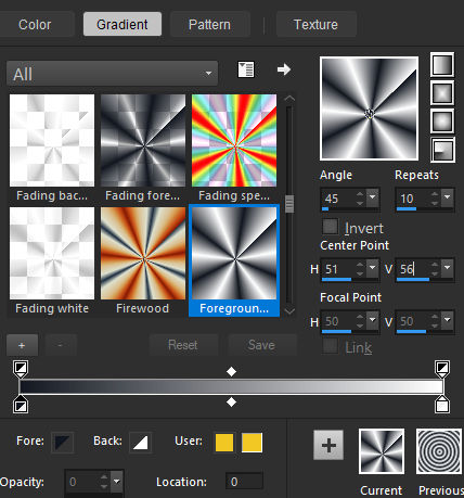 Forme no Primeiro Plano um gradiente Sunburst e configure como segue.