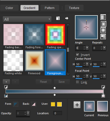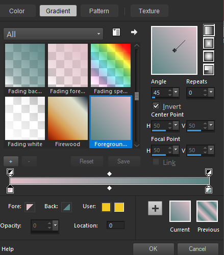Estilos e Texturas => Primeiro Plano cor 1 / Plano de Fundo cor 2Prepare um gradiente no Primeiro Plano / Estilo Linear e configure como segue: