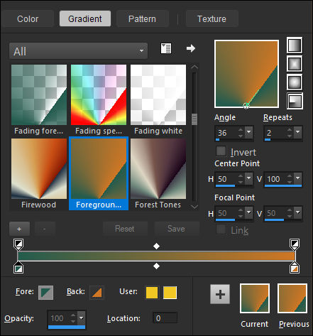 Forme no primeiro plano um gradiente «Radial» Angle 36 / Repeats 2... como segue: