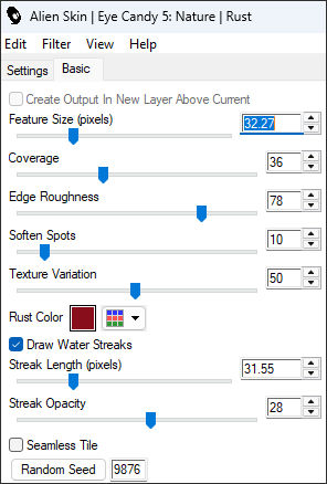 10- Layers / New Raster layer Layers / Arrange / Move Down Effects / Plugins / Alien Skin Eye Candy 5: Nature / Rust
