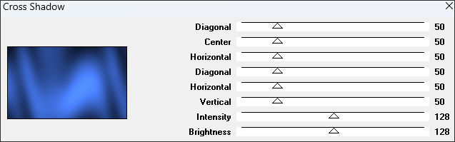 01- Abra uma nova imagem transparente de 1000 X 600 Pixels Preencha com a cor do Primeiro Plano (cor 1) Effects / Plugins / Graphics Plus / Cross Shadow ...Default