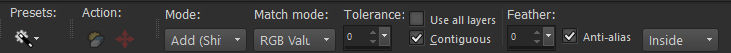 12. Ative a Magic Wand Tool com Feather and Tolerance em 0...MODE : Add (Shift) e INSIDE selecionado.