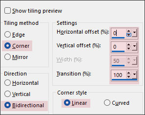 Effects / Image effects / Seamless Tiling: Corner / Bidirectional/ Linear: 0 / 0 / 100