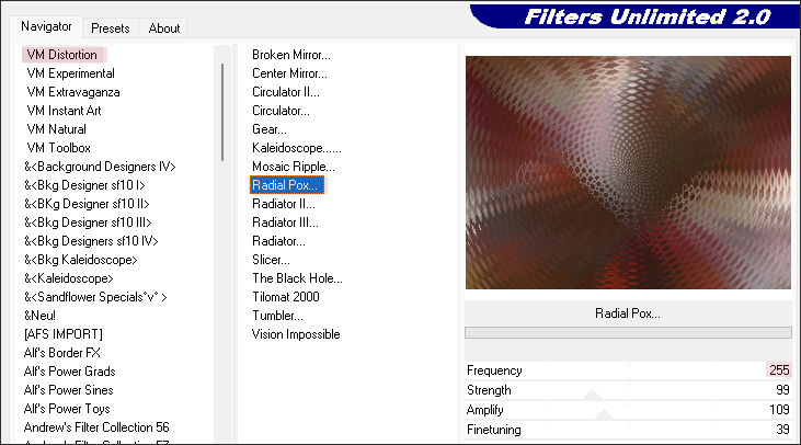 Effects / Plugins / Filters Unlimited 2.0 / VM Distortion / Radial Pox: