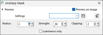 Adjust / Sharpness / Unsharp Mask : 2 – 30 – 2 – Luminance only desmarcado