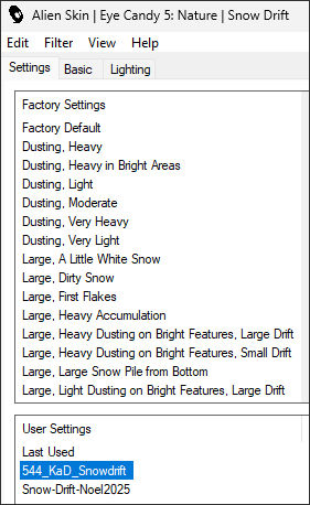20. Adjust / Sharpness / SharpenEffects / Plugins / Alien Skin / Eye Candy 5 / Nature / Snowdrift