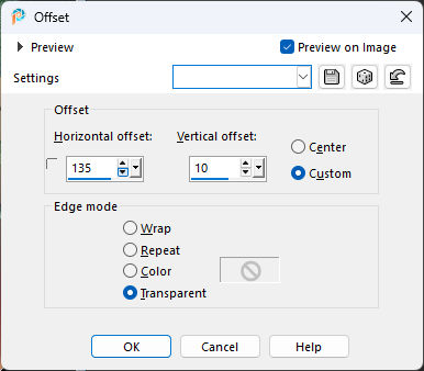 16- image / resize / 55% ...resize all layers ... DesmarcadoEffects / image effects / offset: H : 135 / V : 10 / Custom / Transparent...Marcado.