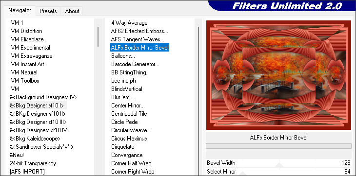 37. Effects / Plugins / Filters Unlimited 2.0 / &<Bkg Designer sf10 I / ALF's Border Mirror Bevel: 128/64
