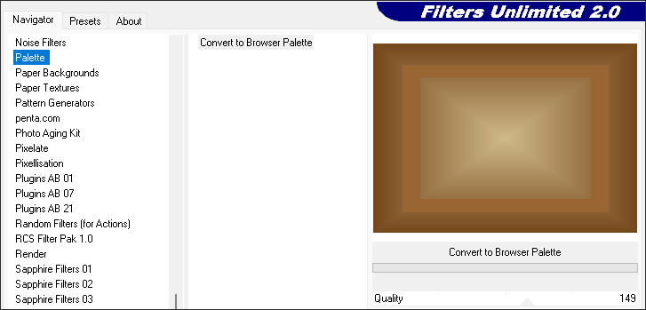 3- Effects / Plugins / I.C.NET software / Filters Unlimited 2.0 / Palette /Convert to Browser Palette: 149