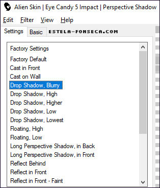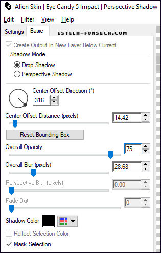 59- Effects / Plugins / Alien Skin Eye Candy5/ Impact / Perspective Shadow / Drop Shadow, BlurryNa Aba Basic mude apenas o valor de "Overal Opacity" a 75: