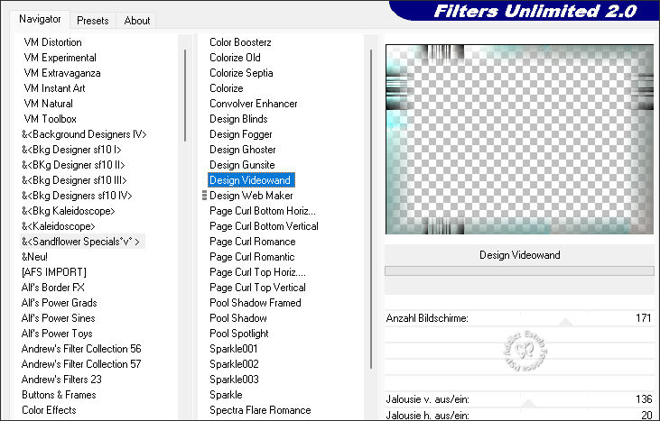 Effects / Plugins / Filters Unlimited 2.0 / &<Sandflower Specials°v° > / Design Videowand