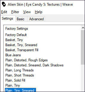 09- Layers / Arrange / Move Up Adjust / Blur / Gaussian Blur / Radius 30 Effects / Plugins /Alien Skin Eye Candy 5 / Texture / Weave / Preset <<Plain, Tiny Smeared