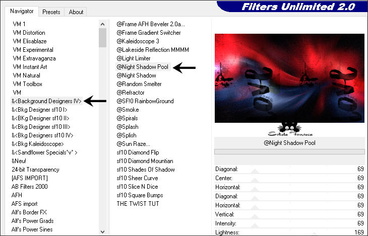8- Effects / Plugins / Filters Unlimited 2.0 / &<Background Designers IV> @Night Shadow Pool
