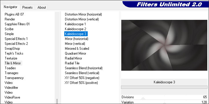 03- Effects / PLugins / Filters Unlimited 2 / Tile&Mirror/ Kaleidoscope 3: 65/128